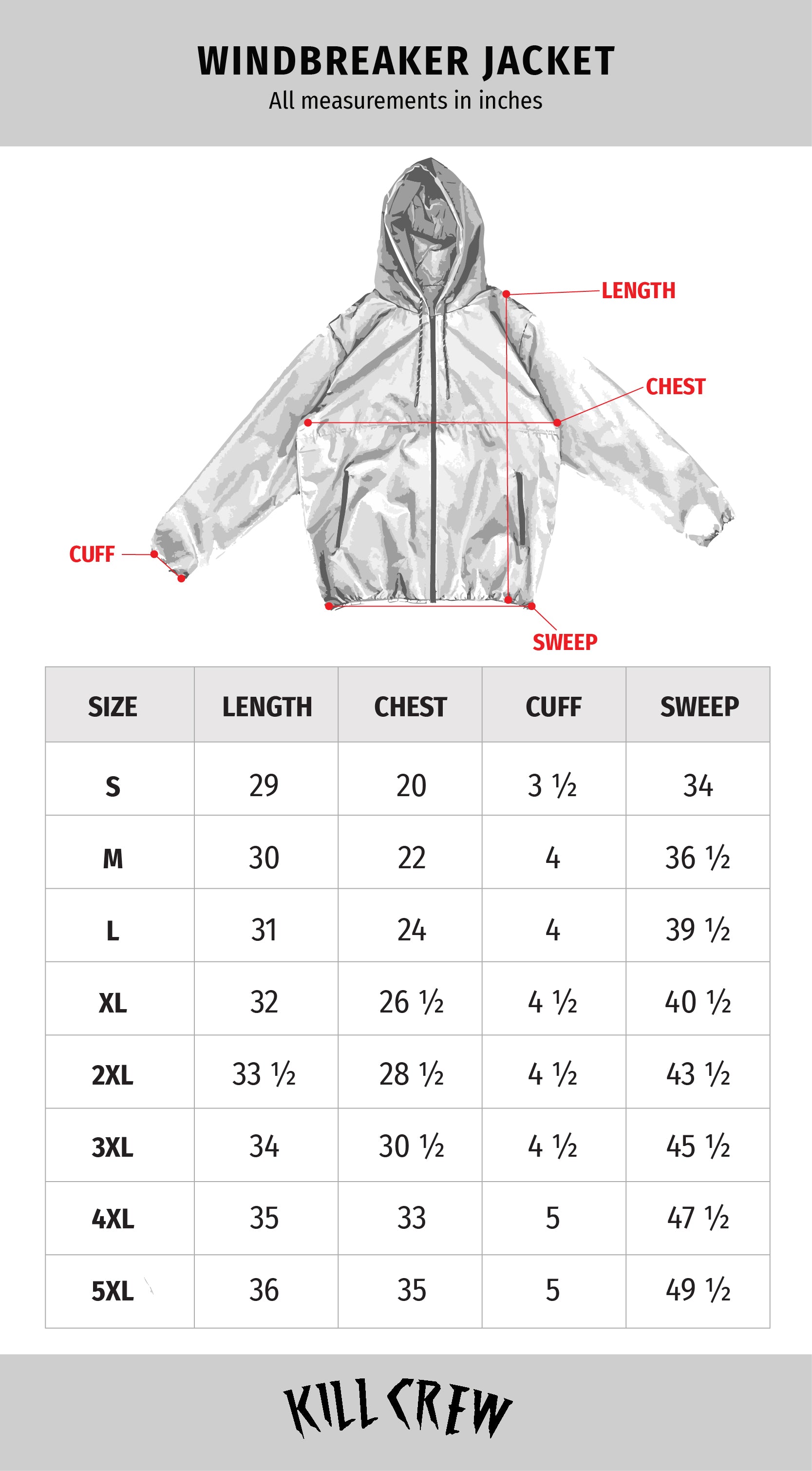 - Sleeve (Inches): XS(24") S(25.19") M(25.98") L(26.37") XL(26.77") 2XL(27.55") 3XL(27.60") 4XL(28.15") 5XL(28.80")